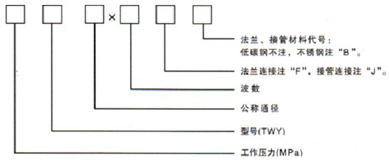 舉例:0.6TNY500TF 表示:公稱通徑為Φ500,工作壓力為0.6MPa,(6kg/cm2)波數為4個,帶導流筒,碳鋼法蘭連接的內壓式波紋補償器。